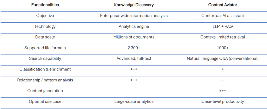 This allows Knowledge Discovery to structure and enrich the information, while Content Aviator generates insights from it or integrates it into workflows.